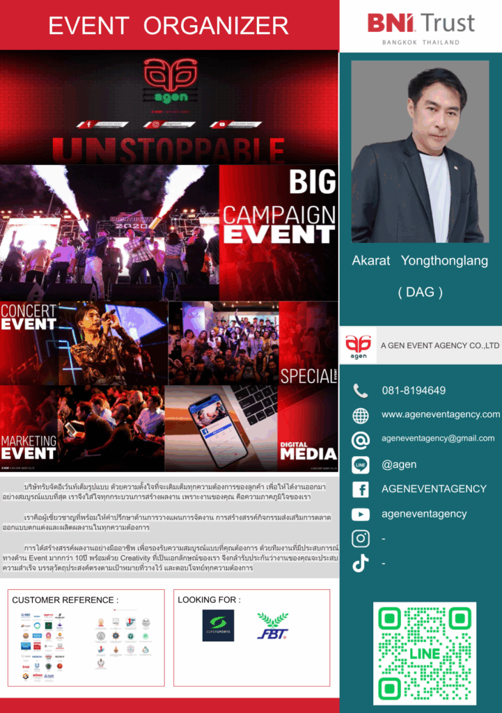 การได้สร้างสรรค์ผลงานอย่างมืออาชีพ เพื่อรองรับความสมบูรณ์แบบที่คุณต้องการ ด้วยทีมงานที่มีประสบการณ์ทางด้าน Event มากกว่า 10ปี พร้อมด้วย Creativity ที่เป็นเอกลักษณ์ของเรา จึงกล้ารับประกันว่างานของคุณจะประสบความสำเร็จ บรรลุวัตถุประสงค์ตรงตามเป้าหมายที่วางไว้ และตอบโจทย์ทุกความต้องการ