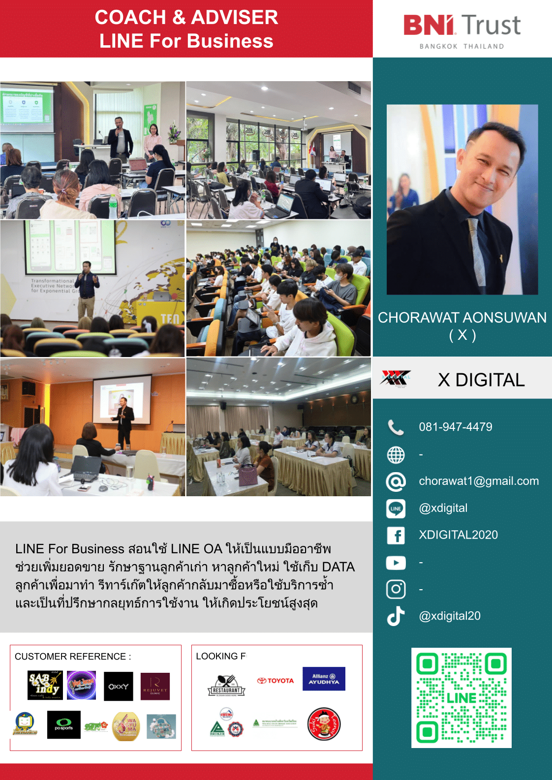 LINE For Business สอนใช้ LINE OA ให้เป็นแบบมืออาชีพ ช่วยเพิ่มยอดขาย รักษาฐานลูกค้าเก่า หาลูกค้าใหม่ ใช้เก็บ DATA ลูกค้าเพื่อมาทำ รีทาร์เก๊ตให้ลูกค้ากลับมาซื้อหรือใช้บริการซ้ำ และเป็นที่ปรึกษากลยุทธ์การใช้งาน ให้เกิดประโยชน์สูงสุด