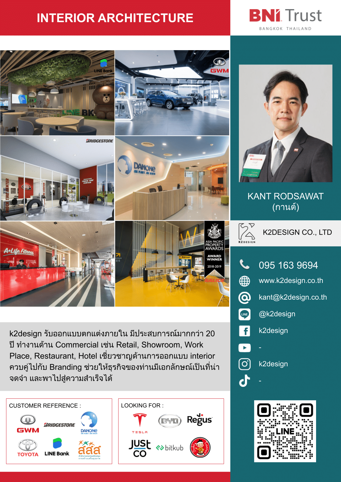 k2design รับออกแบบตกแต่งภายใน มีประสบการณ์มากกว่า 20 ปี ทำงานด้าน Commercial เช่น Retail, Showroom, Work Place, Restaurant, Hotel เชี่ยวชาญด้านการออกแบบ interior ควบคู่ไปกับ Branding ช่วยให้ธุรกิจของท่านมีเอกลักษณ์เป็นที่น่าจดจำ และพาไปสู่ความสำเร็จได้