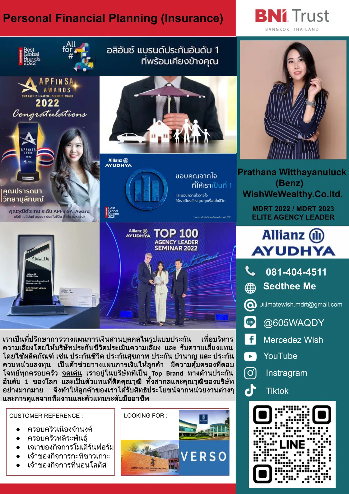 เราเป็นที่ปรึกษาการวางแผนการเงินส่วนบุคคลในรูปแบบประกัน เพื่อบริหาร ความเสี่ยงโดยให้บริษัทประกันชีวิตประเมินความเสี่ยง และ รับความเสี่ยงแทน โดยใช้ผลิตภัณฑ์ เช่น ประกันชีวิต ประกันสุขภาพ ประกัน บำนาญ และ ประกันควบหน่วยลงทุน เป็นตัวช่วยวางแผนการเงินให้ลูกค้า มีความคุ้มครองที่ตอบโจทย์ทุกครอบครัว จุดเด่น เราอยู่ในบรืษัทที่เป็น Top Brand ทางด้านประกันอันดับ 1 ของโลก และเป็นตัวแทนที่ติดคุณวุฒิ ทั้งสากลและคุณวุฒิของบริษัทอย่างมากมาย จึงทำให้ลูกค้าของเราได้รับสิทธิประโยชน์จากหน่วยงานต่างๆและการดูแลจากทีมงานและตัวแทนระดับมืออาชีพ